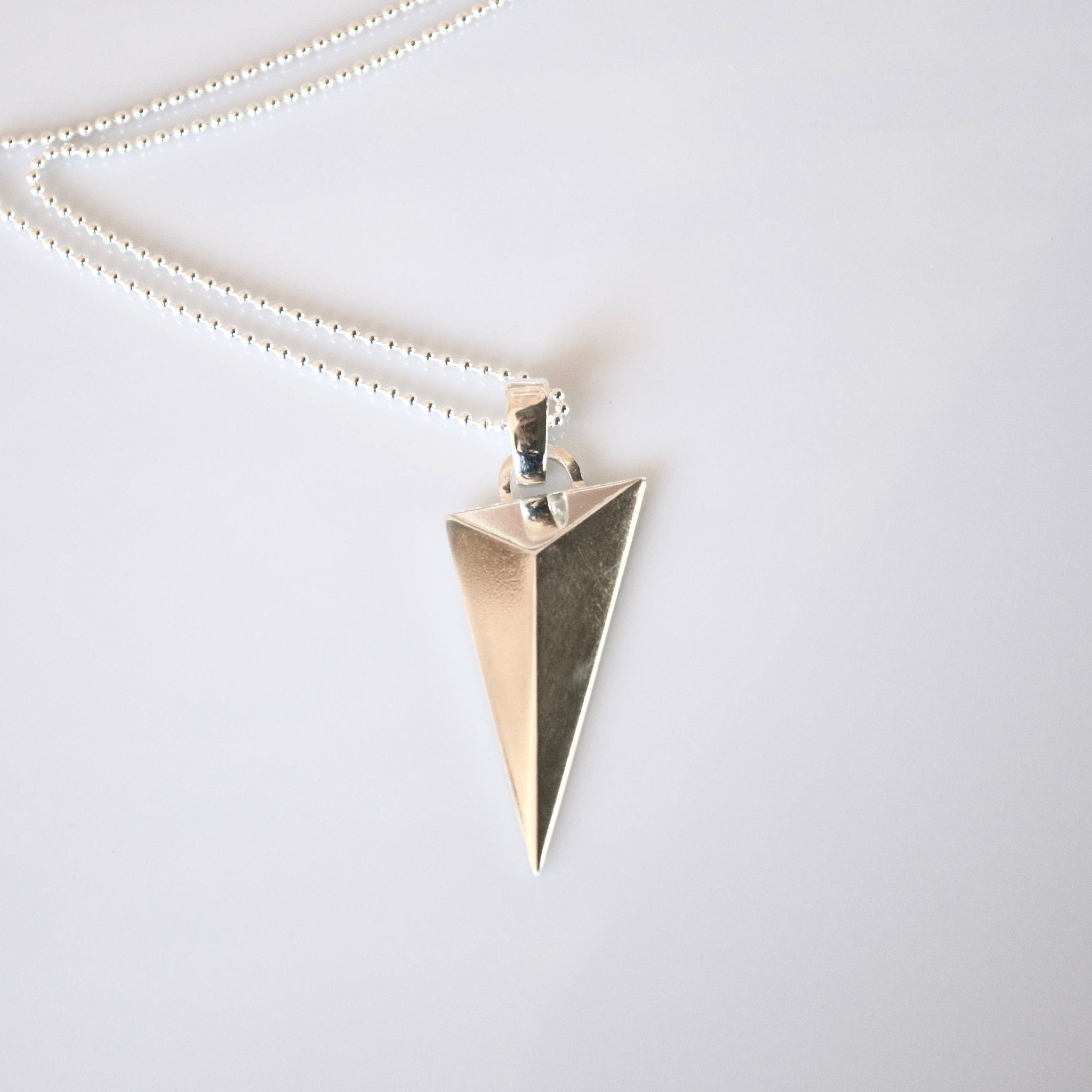 Handcrafted natural Solid Sterling Silver pendant. A statement piece, I call it my "Large Arrow Pendant", and it is part of the Arrow Range. This statement necklace is handmade in solid sterling silver 925. In the pictures it has been finished with a high polished silver. It can also be made in a satin (matt) silver finish. It hangs on a 70cm sterling silver ball chain. Easy to co-ordinate with other jewellery items and is great for layering!