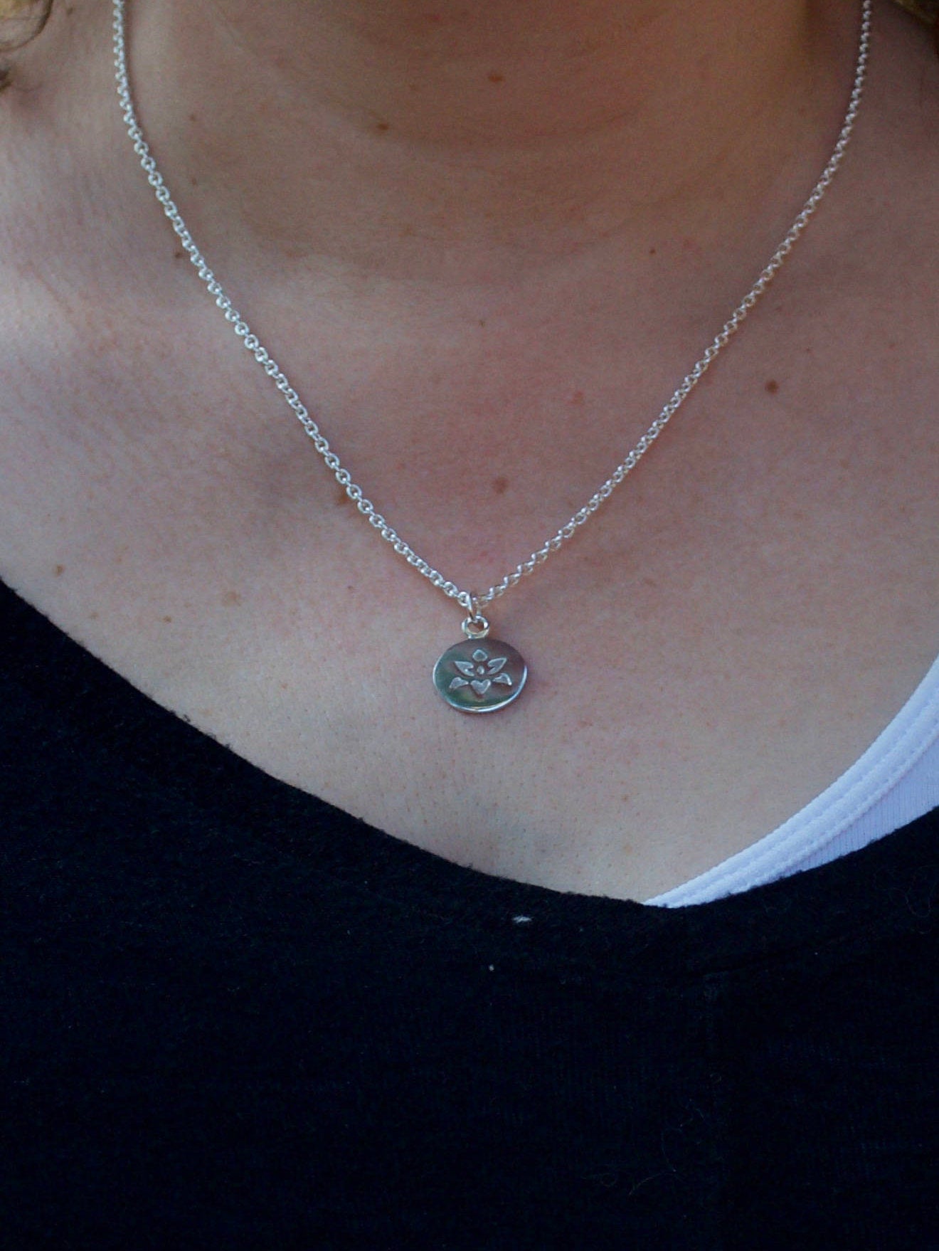 Handcrafted natural Solid Sterling Silver necklace called the "Round Flower Pendant". It is handmade in solid sterling silver 925. This pendant is a 14mm sterling silver disc stamped with a flower design. It hangs on a 45cm sterling silver chain. In the pictures it has been finished with a high polished silver and the stamped flower is not oxidised. The flower design can be oxidised if selected. This is a very sweet necklace, easy to wear anytime.