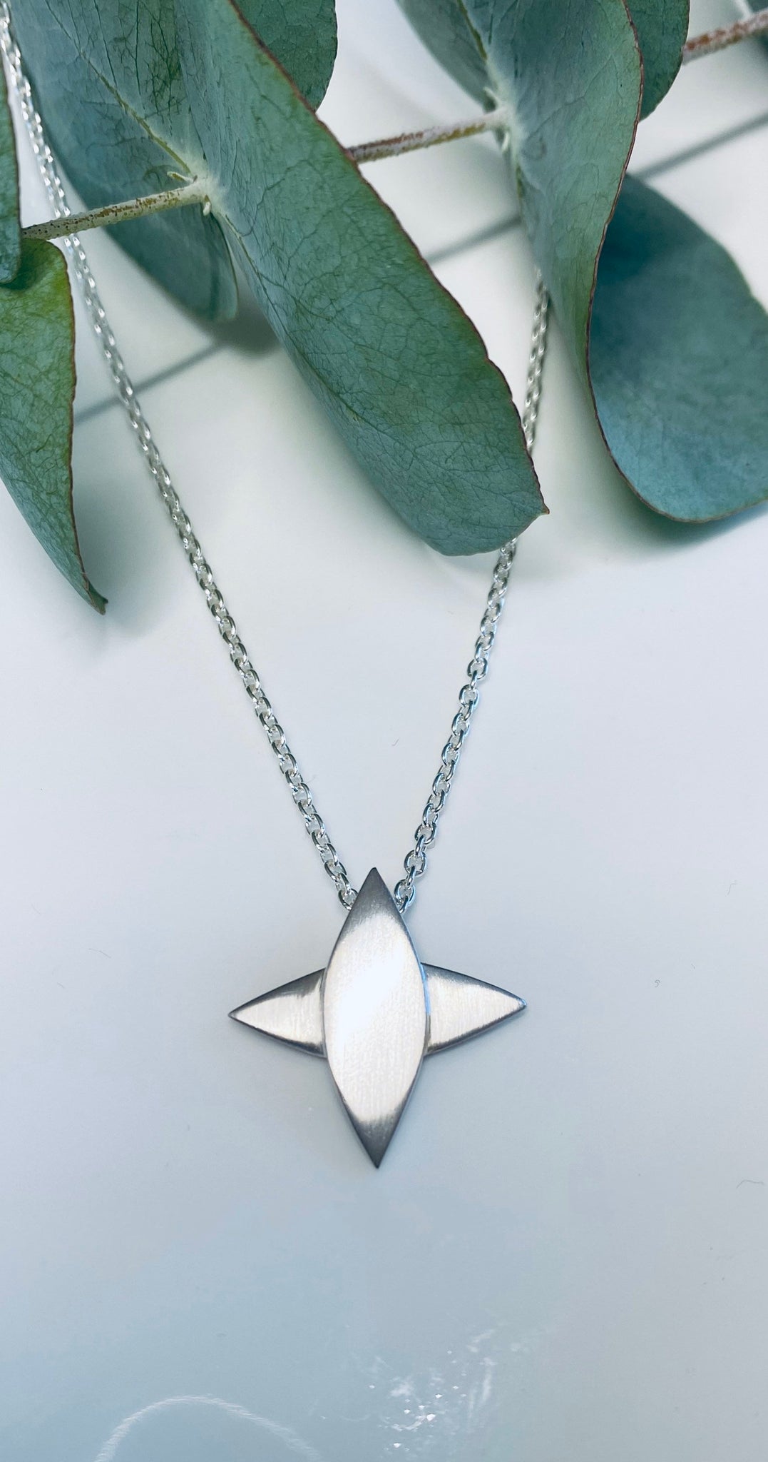 The stunning Star Crossed pendant is made from solid sterling silver. It makes an understated statement as it floats on a sterling silver chain. Can be made with a high polish or satin finish.