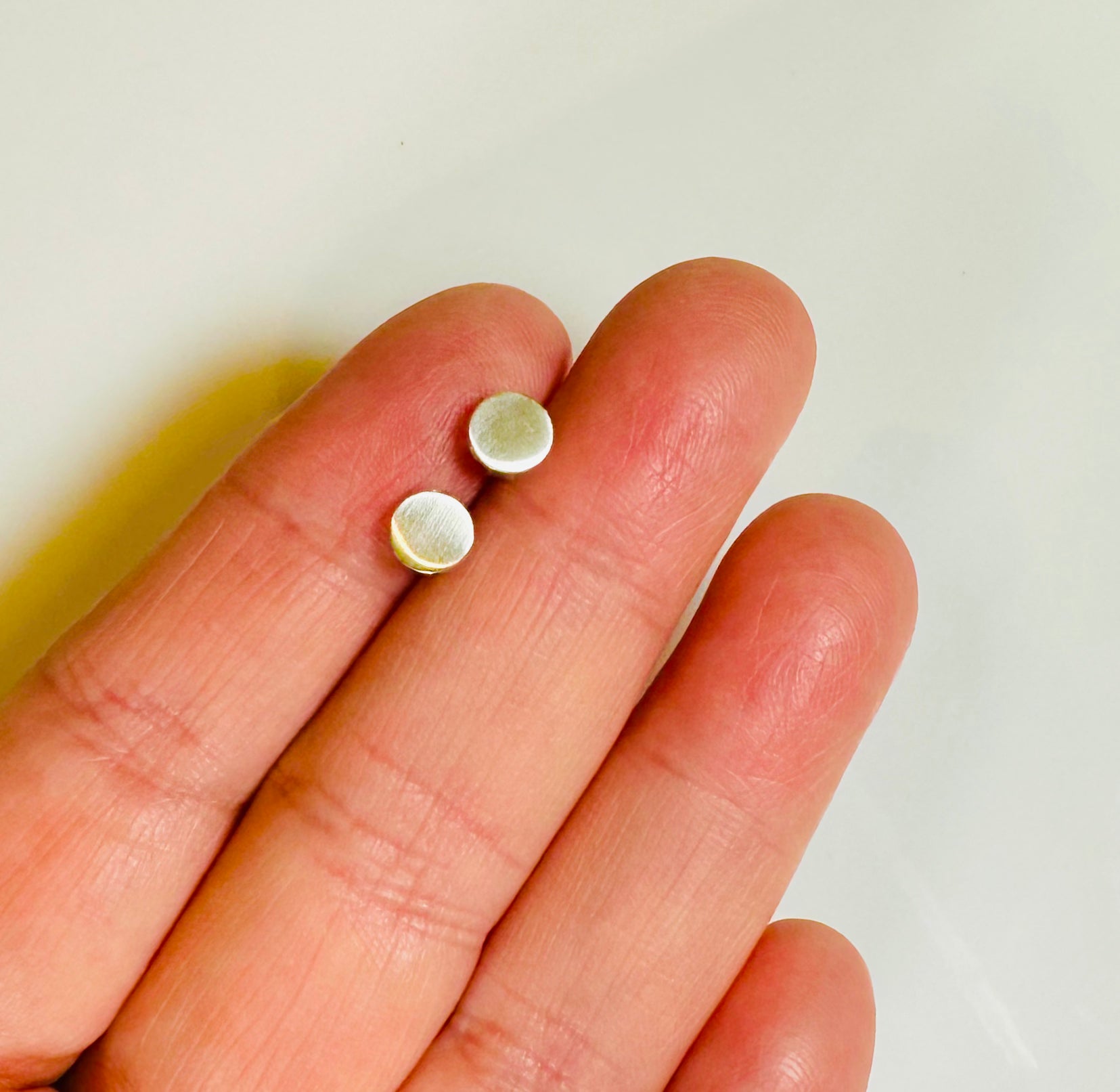 Round Studs in Sterling Silver. Can be ordered in a high policy, satin or hammered finish. Perfect for everyday wear!
