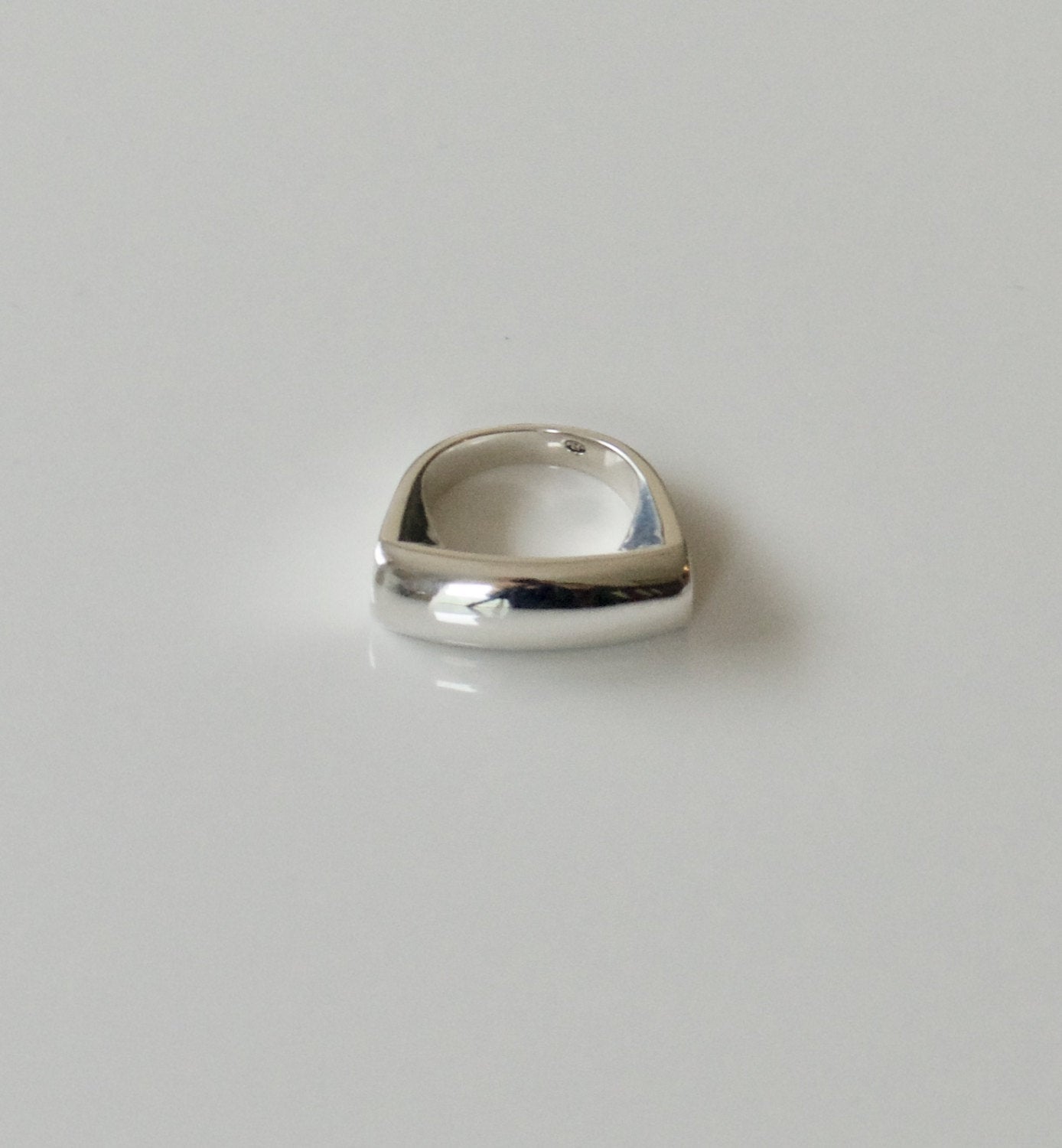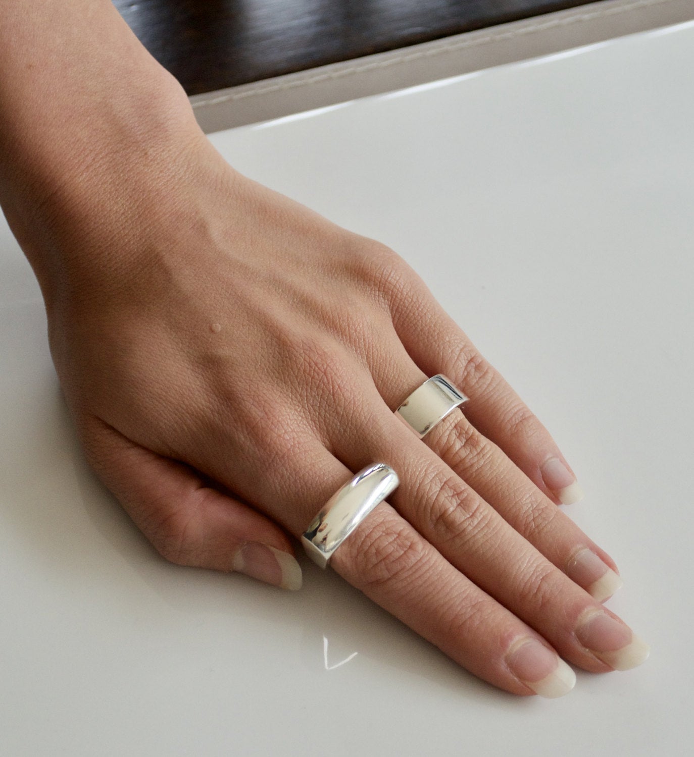 Handcrafted natural Sterling Silver "curve" ring. This statement ring draws on my love of understated chunky jewellery. It is a very flattering ring on the finger and is suitable for every day or when dressing up. It can be worn as a statement ring or to co-ordinate with other jewellery pieces. Being a solid silver ring, this piece has some weight to it and will stand the test of time. In the pictures it has been finished with a high polished silver on the inside and outside. It can also be made in a satin (matt) silver finish.